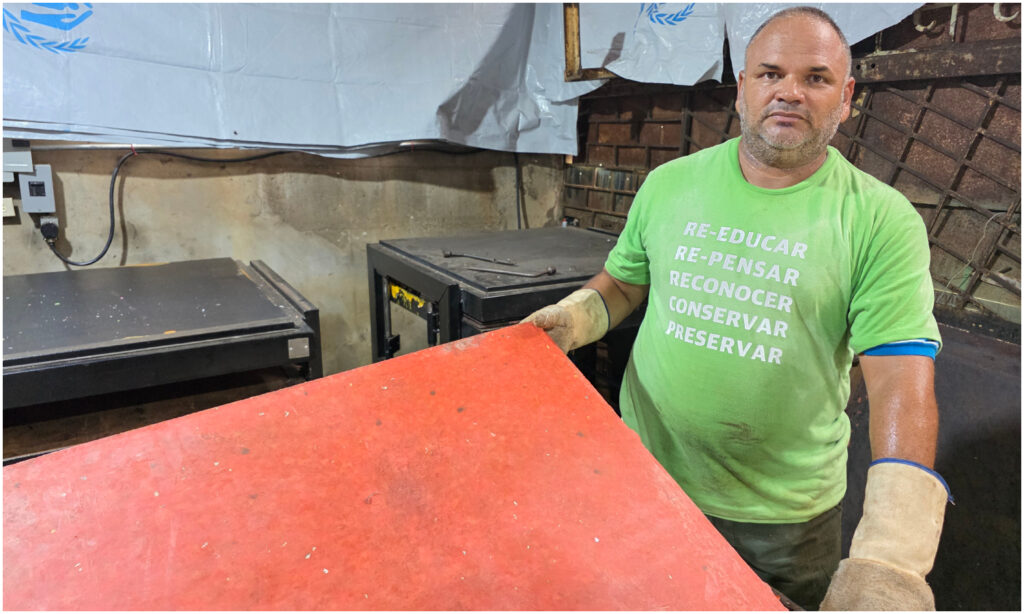 El plástico triturado regresa al galpón para su transformación final. El equipo esparce el material en un molde de acero de un metro por un metro, cuidando que la distribución sea uniforme.