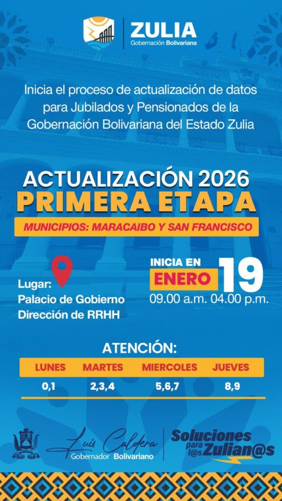 La Gobernación del Zulia anunció el inicio del proceso de actualización de datos dirigido a jubilados y pensionados adscritos a la administración regional, con el objetivo de mantener al día los registros administrativos y garantizar la correcta atención de este sector.