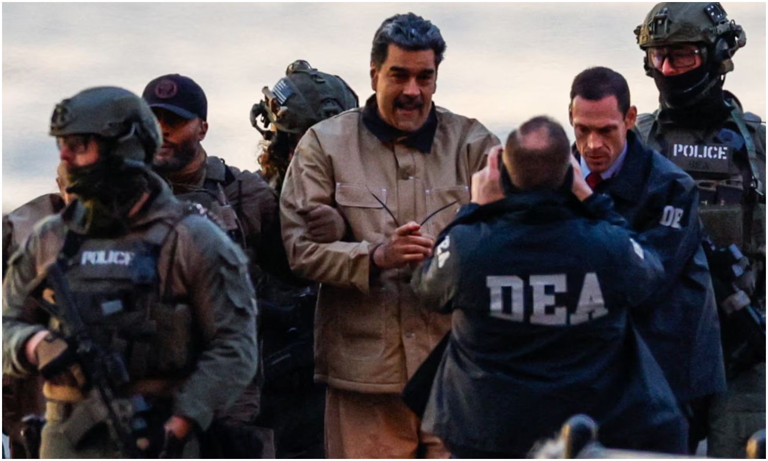 Las imágenes difundidas muestran a Maduro, de 63 años, esposado y bajo fuerte custodia de agentes armados. Junto a él, las autoridades trasladaron también a su esposa, Cilia Flores, quien permanece bajo custodia mientras avanzan los procedimientos legales.